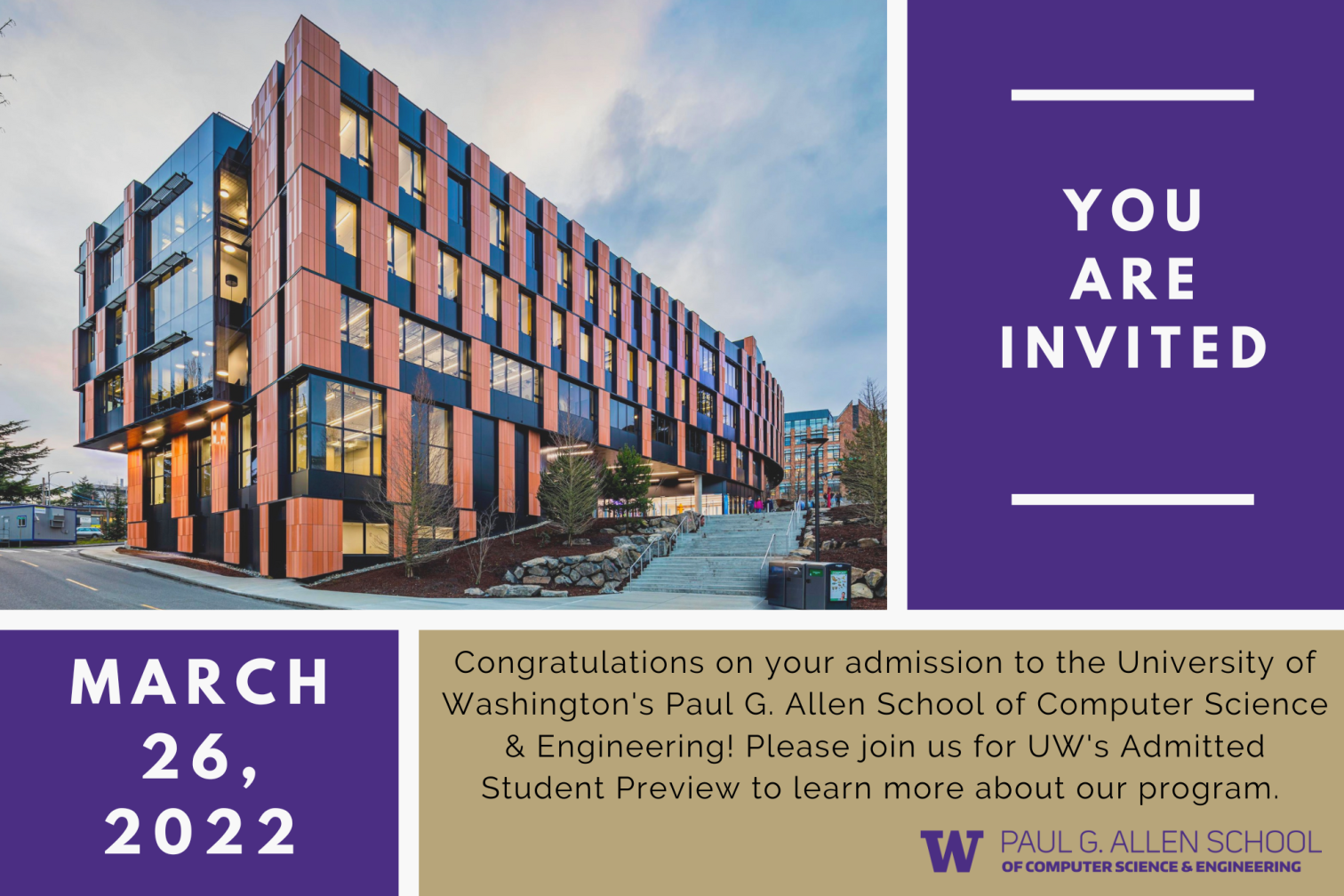 Created 9x6 in. postcard to invite all directly admitted Allen School students to the University of Washington campus and virtual events.